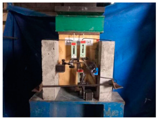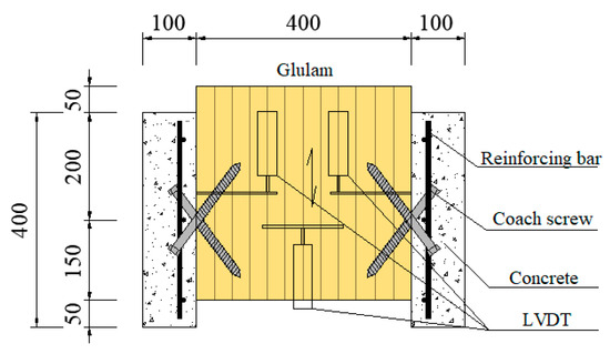 To evaluate the shear performance of the crossed inclined coach screws, the push-out tests were carried out in preliminary tests according to EN26891 [29]. Two groups of specimens with 3 samples in each group were analyzed in this study by adopting screws with different diameters. The specimens with 16 mm diameter screws were named CBIS16-200 and those with 12 mm diameter screws were named CBIS12-200. The length of the screws was 200 mm and the inclined angle was 45°. The test sample is shown in Figure 2. The predrilling diameter for CBIS16-200 was 12 mm, while that for CBIS12-200 was 9 mm. The screws were inserted using an electric wrench with a maximum torque moment of 200 N·m. A multifunctional testing device with a maximum load capacity of 250 kN produced by Hangzhou POPWIL electromechanical control engineering co., ltd., China was used for the test. The test setup for the push-out test is shown in Figure 3.