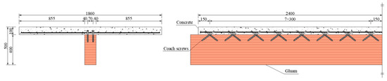 The timber beams and the concrete slabs were connected with crossed inclined coach screws. The test explored two sizes of coach screws, the beam with 12 mm diameter screws was named TCC0.4-CO12, and the others were all 16 mm. The spacing between the connectors was 300 mm in length of beam and 70 mm in width. The details of the parameters of the TCC beams are listed in Table 3, and an example of the TCC beam is shown in Figure 4.