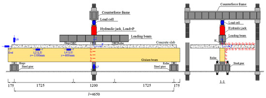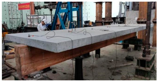 All of the TCC beam specimens were tested under the same boundary conditions, with one hinge support at one end and a roller support at the other end, as shown in Figure 5. The specimens were placed in the central line of the supports, and the clear span of all beams was 4650 mm.