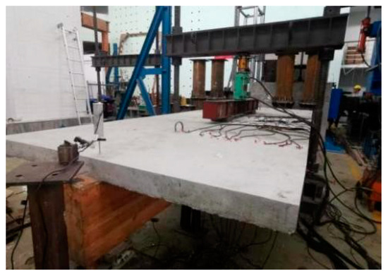 The concrete slabs were poured with C40 grade cast in situ concrete. The compression tests were conducted on the concrete cubes with a side length of 150 mm under natural curing for 28 days. The Young’s modulus and the tensile strength of the concrete were obtained via tests according to GB50010-2010 [28]. The tests were conducted using a Microcomputer-controlled automatic pressure tester produced by Sansi Instrument Manufacturing Co., Ltd. (Shanghai, China). The basic mechanical properties of the concrete are shown in Table 2.