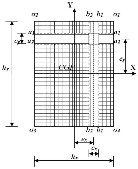 - When the column is located at a distance hy/2 − cy/2 − d from the center of the footing in the positive Y direction and on the Y axis, then ex = 0 and ey = hy/2 − cy/2 − d are substituted into Equation (17) and Vufc1 = 0 is obtained;