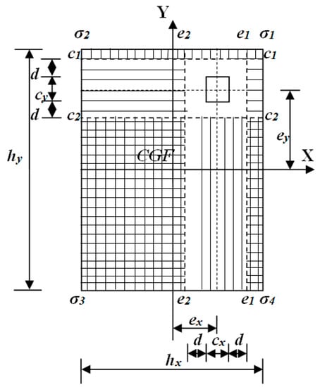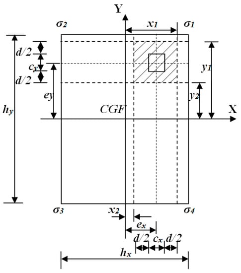 - When the column is located at a distance −hy/2 + cy/2 + d from the center of the footing in the negative Y direction and on the Y axis, then ex = 0 and ey = −hy/2 + cy/2 + d are substituted into Equation (19) and Vufc2 = 0 is obtained;