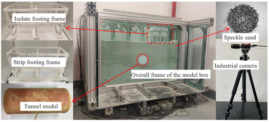 The self-developed laboratory model test system was used in the experiment, as shown in Figure 1. The span of the building frame is the same as the tunnel diameter. The overall frame of the model box is made of aluminium alloy, and the four walls are made of transparent tempered glass to allow for the acquisition of digital images of structure model and soil. The width of the box can be freely adjusted to satisfy the research requirements, and the internal dimensions of the model box are set to 1.5 m × 1 m × 0.3 m in this study [15].