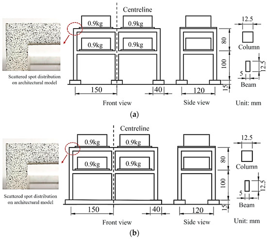 The inter-story load in the actual buildings is taken as 8 kN/m2, which is applied in the form of a loading box. Since the inter-story load and the elasticity modulus share the same dimension, the similarity ratio of load is also set to 1:16.6. In addition, the distance between adjacent columns along the length of the frame is 150 mm, and the distance between columns in the width direction is 120 mm; so, the mass of a single loading box is 0.15 m × 0.12 m × 8000 N/m2/16.6/10 N/kg = 0.9 kg.
