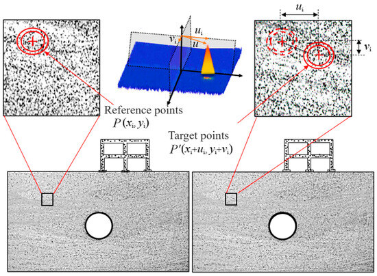 In the monitoring process of the DIC, an industrial camera is used to take pictures continuously, and the displacement or deformation contours of the whole section can be obtained by processing the global target points in the photos at different times. DIC is an image-based non-contact measurement technique in which a series of images are compared with a reference image or each other to acquire the displacement of the target object. We can thus identify the location of a sub-image in the deformed image and determine the displacement components by minimizing or maximizing the correlation coefficient. The point P’(xi + ui, yi + vi) after deformation corresponding to the coordinate P (xi, yi) in the reference image can be obtained by searching for a match in region of interest (ROI). On this basis, full-field displacements related to varied loading stages can be determined by optimizing the correlation function. More details on DIC can be found in previous studies [17,18]. The DIC monitoring principle is shown in Figure 3.