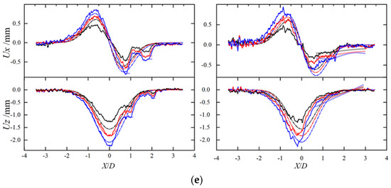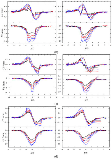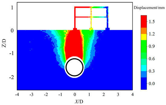By extracting from DIC monitoring data, the complete strain field contours of the formation and structure under different working conditions can be obtained. The vertical displacement contours under isolated footings corresponding to e = 1D are shown in Figure 5 for instance. Ground movements and structural distortion characteristics can be analysed based on the different strain contours obtained.