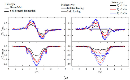 The displacement curves of the ground surface and footings were extracted and drawn in Figure 6, where the surface displacement curves of greenfield are drawn in dashed lines as a reference for comparison, where displacement curves of soil beneath foundation are presented in solid lines, while that under greenfield are presented in dotted lines, and tunnel volume loss of Vl = 1.5%, 2.4% and 3.4% are in black, red and blue, respectively. For different foundations, isolated footings are represented by thin lines, and strip footings are represented by thick lines. Positive horizontal and vertical displacements are oriented towards the right and upwards, respectively, while positive volumetric strains are contractive.