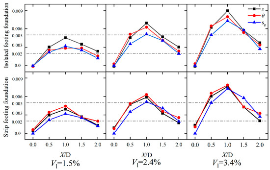 With the increase in the eccentricity, the overall slope (s) and tilt (θ) variation trend of the both foundation structure is similar, increasing first and then decreasing, reaching the maximum with e = 1D, which is consistent with the trend of greenfield. Compared with the strip foundation, the overall slope and tilt of the isolated foundation is slightly larger at the same eccentric distance.
