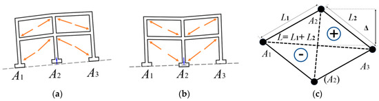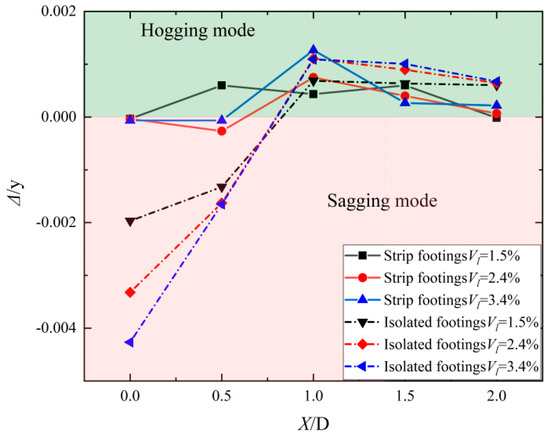 The variation of the deflection ratios caused by the differential vertical displacements of middle and end points on the foundations can be used to subdivide structural deformation characteristics into sagging and hogging, as shown in Figure 10. The deflection ratio can be defined as Δ/L, where Δ is the relative settlement of middle point, a positive value corresponding to hogging mode while a negative value corresponding to sagging mode, and L is the length of the frame. Typically, since the main reinforcement is mainly set at the bottom of the beam, foundation and other elements, the hogging mode is likely to be more damaging than the sagging mode for a given deflection ratio [25].