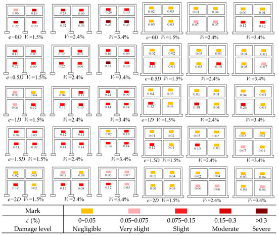 It can be seen that the isolated foundation buildings would present a higher damage level than that with the strip foundation at the same location. In addition, it is worth noting that the trends with the location are different for two foundation structures: the damage of the isolated foundation structure tends to decrease with the eccentricity, while the damage increases firstly and then decreases for strip foundation structure, reaching the maximum damage level with e = 1D. It needs to be said that the structural model was simplified without walls in this study, that is, the resistance of walls to panel deformation was ignored. The calculated maximum tensile strain value should be larger than that of the actual building, but the overall variation trend of damage degree has an important reference value for practical engineering.