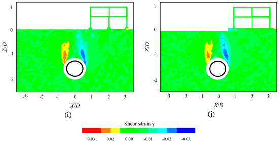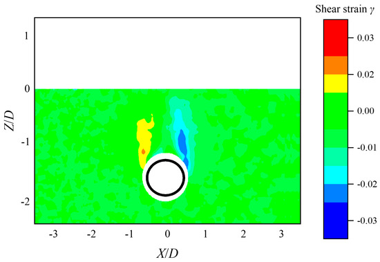 To comprehensively characterize tunnel–soil–frame interaction, the DIC data were processed to obtain the shear-strain contours for selected tests at a tunnel volume loss of Vl = 3.4%. The shear-strain distribution in the greenfield is shown in Figure 13, and the shear-strain contours within ground and structural elements under different foundation structures are shown in Figure 14.