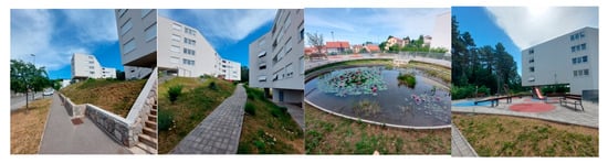 Prinz Eugen Park is profoundly recognizable, even though different parts of it have different aesthetic and functional appearances (Figure 3). The composition of the built environment is dynamic in terms of rhythm of volumes, façade plasticity, and diversity in the use of open spaces. Open spaces in the district are connected by numerous paths, creating dynamic experiences. The dynamically composed configuration of urban elements, landscape, and architecture (Figure 2) in Domagkpark also creates a distinct and recognizable neighborhood (Figure 4). Walking or cycling along the mobility axis engages sensory perceptions of visitors to participate in co-creating the public atmosphere.