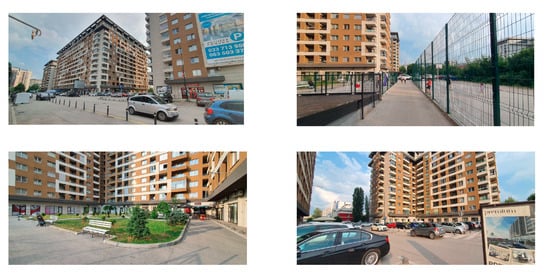 Tibra embodies an unnatural contrast to the context of the location. It faces the main street but is fully detached from the existing urban tissue. No traces of greenery and natural elements exist there, and the population density is above average due to the large number of apartments on a small footprint (Figure 9 and Figure 11). This makes Tibra a prime example of contemporary vertical urban sprawl. Despite the fact that many people found an apartment there at a cheap price, the intrusive massing of volumes inflicted an open wound in the urban tissue. However, the neighborhood incorporated various everyday life amenities. It is extremely poorly organized and not walkable. The web of dark walkways is inappropriate for cycling (Figure 11), but public transport stations are located fairly close. Alipašin Most is better integrated in the existing urban tissue. It faces the main street, and façades have some dynamic compositional features (Figure 12). However, the scale is out of proportion. These buildings are bulky, placed in such a manner that prevents wind circulation, thus contributing to air pollution.