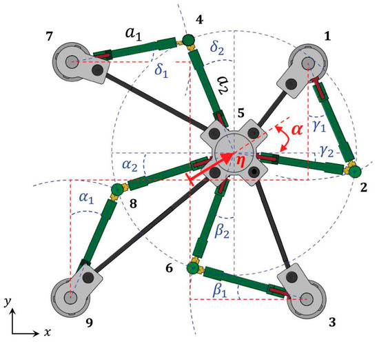 Let and denote the lengths of the two members forming each limb of the generic layer, and ; ; ; the angles formed by such members with the axes of Cartesian fame , as shown in Figure 2. The deformed positions of the elbow/knee joints are obtained by intersecting a circle with a radius centered at a corner post and a circle with a radius centered at the deformed position of the central post. The latter is obtained by giving to such a post a displacement with magnitude ( in the bottom layer; in the top layer), along a direction inclined at an arbitrary angle with the -axis (Figure 2).