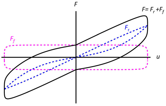 In Equation (4), and denote reference values of the vertical load and the sliding velocity, respectively, while and indicate additional constitutive parameters [10]. The experimental results presented in [23] and those given in Section 4 of the present manuscript show that the adopted model (Figure 3) adequately captures the recentering action of the tendons on the central post, and the friction effects acting at the interfaces between the sliders placed at the extremities of the central post and the terminal plates.