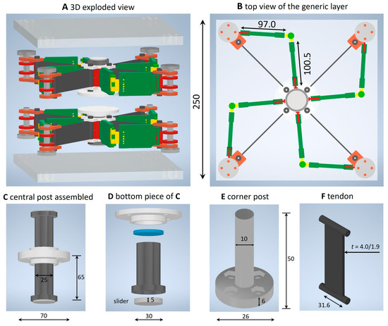 The single-layer SSI is formed by a central post that translates in solidarity with a top plate and is free to slide against a bottom plate. The top plate transmits the vertical load applied by the superstructure, while the bottom plate is attached to the foundation (Figure 1A). The central post is connected to four fixed corner posts through rigid and articulated “limb” members and stretchable tendons. The limbs of the device drive the motion of the central post and are connected to each other through vertical hinges (elbow and knee joints). The deformable tendons play a recentering role and dissipate energy through hysteretic pseudo-elasticity. A cap covers the central post and permits the relative rotation between the post and the top plate (the reader is referred to Ref. [23] for further details about the SSI1 system).