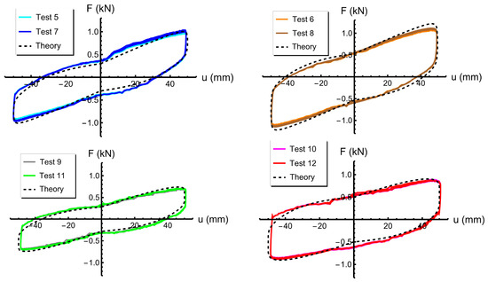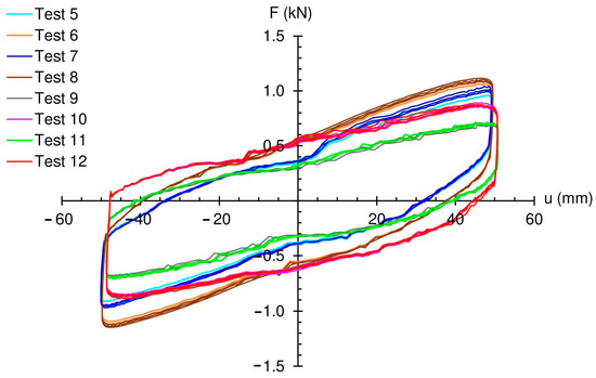 Figure 6 shows the F vs. u responses of the tested samples (after the training cycles), which highlight the achievement of the maximum (absolute) lateral force in correspondence to sample #1 with 4.0 mm thickness of the tendons–membranes under P = 10 kN (test #8), and the minimum (absolute) lateral force in correspondence to sample #2 with 1.9 mm thickness of the tendons under P = 5 kN (test #11). One also observes from the results in Figure 6 that the samples equipped with 4.0 mm tendons exhibit more marked recentering components of the F-u laws (tests #7,8), as compared to the samples exhibiting 1.9 mm tendons (tests #11,12). The F-u curves recorded for tests #7,8 indeed exhibit loading and unloading branches with slightly larger slopes, over the F-u curves recorded for tests #11,12. The latter instead shows a more pronounced oval profile, which indicates the prevalence of the friction component on the overall F-u response (cf. Figure 3). The effective properties of the examined samples are discussed in the following section. Illustrative movies of the examined tests are provided as Supplementary Materials (Movies S1–S4).