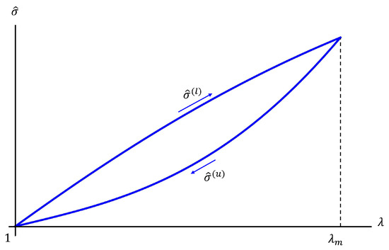 We fitted the mechanical model of Section 2 to the experimental results presented in the previous section. For what concerns the constitutive model of the tendons, we make use of the pseudo-elastic stress–strain law formulated in [23] in the absence of permanent strains, assuming that the preconditioning of these members reduces such deformations nearly to zero [31]. We hereafter summarize the above model, which contemplates different shapes of the relationship between the nominal stress and the stretch ratio along the loading and unloading branches, as shown in Figure 7. The loading branch is described by the equation