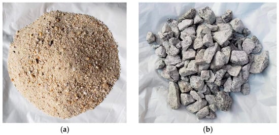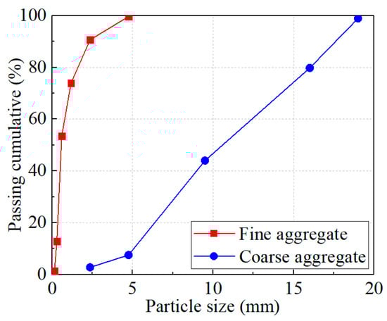 The SSC was made up of simulated seawater, ordinary Portland cement, sea sand, and granite gravel. Seawater was obtained by manual preparation, and its ingredients were NaCl, MgCl2, Na2SO4, CaCl2, KCl, NaHCO3, KBr, H3BO3, SrCl2, NaF, and distilled water [40]. Moreover, simulated seawater had a density of 1015 kg/m3. The apparent density and strength grade of ordinary Portland cement were 3112 kg/m3 and 42.5 MPa. The sea sand, which had an apparent density of 2620 kg/m3 and a fineness modulus of 2.36, was categorised as medium sand. The water absorption and apparent density of granite gravel were 1.06% and 2661 kg/m3. The appearance and particle size gradation of sea sand and granite gravel are shown in Figure 1 and Figure 2, respectively. According to the testing method in GB/T 14684-2011 [41], the chloride ion content in sea sand was 0.081%, and the chloride ion content in seawater was 16,263.2 mg/L. For the mix proportion of SSC, the contents of simulated seawater, sea sand, ordinary Portland cement, granite gravel, and polycarboxylates high-performance water-reducing admixture were 205 kg/m3, 410 kg/m3, 642.6 kg/m3, 1142.4 kg/m3, and 3.2 kg/m3, respectively. Three standard cylinder specimens with the dimension of φ150 mm × 300 mm were prepared to measure the compressive strength of SSC [42,43]. According to the compressive tests of SSC (Figure 3a), average compressive strength and elastic modulus of SSC were 62 MPa and 36 GPa, respectively.