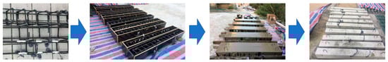 Eight CFRP bar-reinforced SSC beams were designed, as shown in Table 1 and Figure 4. All the beam specimens had a cross-section of 200 mm × 150 mm, length of 1500 mm, and four longitudinal CFRP bars. The beam specimens had a concrete cover thickness of 20 mm. Different load types, load levels, and stirrup spacing were considered. Three beam specimens were prepared to measure their static behaviour, while the other five beam specimens were designed to explore their fatigue behaviour. The CFRP stirrups with the spacing of 100 mm, 200 mm, and 300 mm were selected. The load levels (i.e., the ratio of upper loads to static ultimate loads Pu) of 0.5, 0.6, and 0.7 were designed, and the stress ratio (i.e., the ratio of lower loads to upper loads) was set as 0.2 to determine the lower loads. Each beam specimen was assigned a specimen number. For example, “S-100” meant the beam specimen, which had a stirrup spacing of 100 mm, was subjected to static loads. And “F-100-0.6” meant the beam specimen, which had a stirrup spacing of 100 mm, was subjected to fatigue loads with a load level of 0.6. To precast these beam specimens, CFRP bar cages were prepared, and strain gauges were adhered to CFRP bars to monitor their strain. Subsequently, the CFRP bar cages were put into wood moulds, accompanied by fresh SSC mixture, as shown in Figure 5. After demoulding at the age of one day, the beam specimens were cured by covering them with wet cloths and spraying water thrice a day in a curing room at a temperature of 20 ± 3 °C for 28 days [44,45].