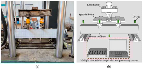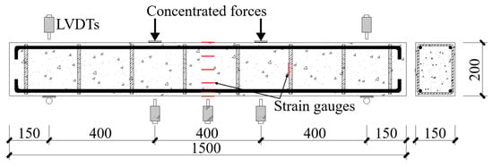 A fatigue testing machine was employed to test the fatigue behaviour of CFRP bar-reinforced SSC beams, as shown in Figure 6. The beam specimens were simple supported at their two ends. The loads were transformed into two concentrated forces by a distributive girder. The distance between two concentrated forces was 400 mm. Three kinds of data were recorded, as illustrated in Figure 7. (1) Five linear variable displacement transducers (LVDTs) were placed along the support positions, loading positions, and mid-span positions of beam specimens to measure their deflection. (2) The surfaces of beam specimens were painted white to monitor the generation and development of cracks. Meanwhile, the crack width was recorded by a crack width measuring instrument. (3) Two strain gauges adhered to the top of mid-span to collect the compressive strain of SSC. And two strain gauges adhered to the bottom of mid-span to collect the tensile strain of SSC. In addition, five strain gauges were installed at equal intervals along the height direction of mid-span to monitor the change in the concrete strain with height. For CFRP bars, strain gauges were installed in the middle of tensile longitudinal CFRP bars to check their working state. Meanwhile, strain gauges were placed at the CFRP stirrups of flexural–shear section to prove the shear resistance provided by CFRP stirrups.