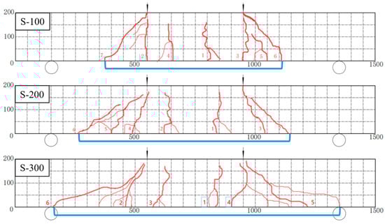 The generation and distribution of cracks on three static beam specimens are plotted in Figure 8. The order of crack occurrence was digitally marked, as shown by the red numbers in Figure 8. The initial crack appeared at the mid-span and developed vertically, implying the pure bending action. Subsequently, the next batch of cracks appeared near the loading positions of beam specimens and developed towards the loading positions. The final batch of cracks appeared in the flexural–shear section and developed towards the loading positions. As shown in Table 2 and Figure 9 and Figure 10, with the increasing stirrup spacing, the crack characteristics and failure modes change.