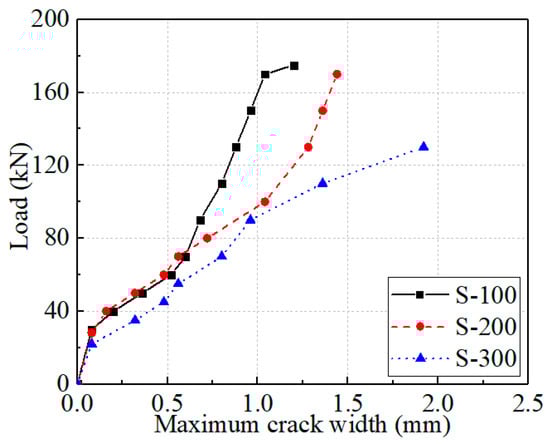 For S-100 with 100 mm stirrup spacing, it had a crack load of 30 kN. Meanwhile, compared with the other two beam specimens, its crack width was the smallest all the time, as plotted in Figure 9. When the load reached the peak, its maximum crack width was 1.2 mm. All the cracks were in or near the pure bending section. And the shear cracks penetrated the oblique section. Finally, the beam specimen S-100 exhibited a shear failure mode with an ultimate load of 175 kN.