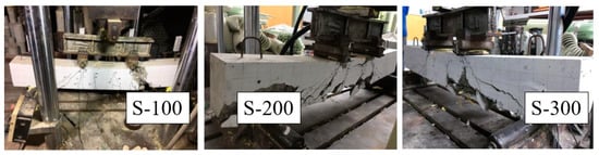 The beam specimen S-300 had a crack load of 22 kN and an ultimate load of 130 kN, which were far smaller than those of S-100 and S-200. Its crack width was the largest all the time, and the cracks were the most widely distributed. When the load reached the peak, its maximum crack width was 1.92 mm. Basically, its shear cracks extended from the support positions to the loading positions. However, the failure of the S-300 was not caused by shear cracks. Ultimately, the SSC in the tension zone was severely flaked, which destroyed the cooperative working state of the tensile CFRP bars and SSC. As shown in Figure 10, due to the serious peeling of SSC in the tension zone, the collaborative work condition between the tensile CFRP bars and SSC was destroyed, meaning the occurrence of bond failure.