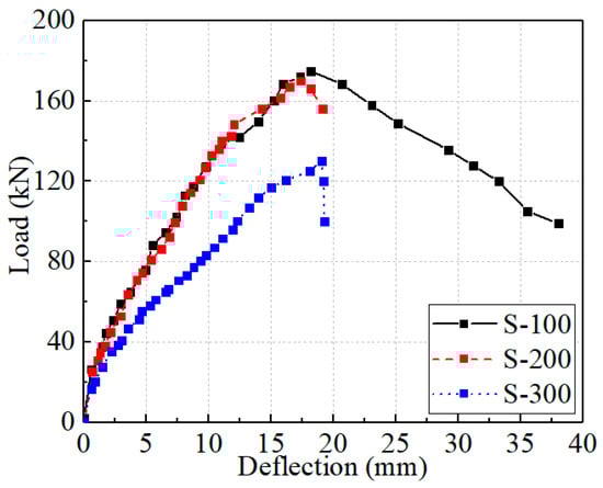 The load–deflection curve of S-200 was very close to that of S-100. However, after the peak, the curve descent rate was faster, and S-200 collapsed rapidly. These results indicated that when the stirrup spacing was between 100 mm and 200 mm, as the stirrup spacing increased, the stirrups still confined the whole beam effectively. Consequently, the ultimate load did not change, but the brittleness of the beam specimen increased.