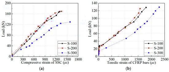 The compressive strain of SSC at the top of beam specimens is shown in Figure 12a. Basically, the compressive strain increased linearly with the load. The compressive strain of S-100 was very close to that of S-200. However, the S-300 exhibited a larger compressive strain at the same load, compared with S-100 and S-200.