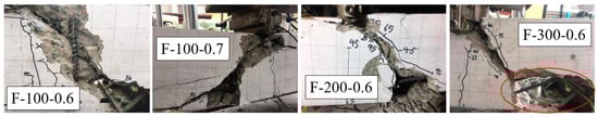 As shown in Figure 13, the fatigue failure mode of F-100-0.6 is similar to that of F-100-0.7, and the oblique cracks penetrated the oblique sections of beam specimens. This indicated that load levels had little effect on fatigue failure modes. In addition, the fatigue failure mode of F-100-0.6 is similar to that of F-200-0.6. This shows that the increase in stirrup spacing from 100 mm to 200 mm had little effect on fatigue failure modes. For F-300-0.6, the confinement effect of stirrups on SSC was insufficient due to the large stirrup spacing, resulting in more serious concrete peeling in the failure. When the stirrup spacing increased from 100 mm to 300 mm, the static failure modes changed from shear failure to bond failure, and the fatigue failure modes also changed. However, the change in fatigue failure modes was that the concrete peeling at the critical diagonal cracks was more severe. This meant the difference between the development of static damage and fatigue damage in beam specimens.