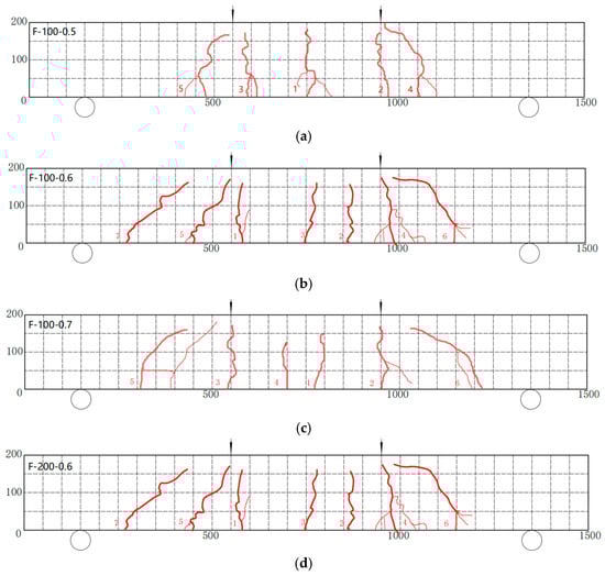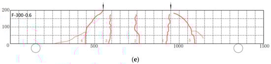 Crack morphology of fatigue beam specimens. (a) F-100-0.5; (b) F-100-0.6; (c) F-100-0.7; (d) F-200-0.6; (e) F-300-0.6.