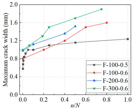 The crack morphology of fatigue beam specimens is shown in Figure 14. The order of crack occurrence was digitally marked, as shown by the red numbers in Figure 14. The crack numbers were between 5 and 6, and the crack development laws and crack patterns were similar. In the static crack morphology, as the stirrup spacing increased, the crack distribution became wider, as shown in Figure 8. However, in the fatigue crack morphology, the crack distribution of all fatigue beam specimens was wider. This is because the cracks tend to occur well in advance under cyclic loads when compared with static load intensities [49]. Moreover, due to the accumulation of microcracks caused by cyclic loads, the number of fatigue cracks is often greater than that of static cracks, and the distribution of fatigue cracks is wider [50]. Due to the fatigue damage, the crack width of beam specimens continued to increase. Figure 15 shows the variation in the maximum crack width at the upper loads with n/N, where n and N are cycle number and fatigue life, respectively. Due to the rapid failure process of F-100-0.7, effective data could not be collected. F-100-0.5 had a long fatigue life and more data acquisition times. Therefore, the maximum crack width curve of F-100-0.5 was more precise. It can be seen from Figure 15 that the maximum crack width of F-100-0.5 increased rapidly in the early cycle, and subsequently increased at a nearly constant rate. In the early cycle, the CFRP bars mainly consumed the work completed by the external load through the cracking of the resin matrix [51,52]. At this stage, the strain growth rate of the CFRP bar under cyclic loads was fast. In addition, there were some initial gaps at the bond interface between FRP bars and SSC, which led to a rapid increase in the slip of the bond interface in the early cycle [53,54]. The above two reasons explained the phenomenon that the maximum crack width increased rapidly in the early cycle. Subsequently, the rate of fatigue damage was basically stable, and the maximum crack width also increased steadily. For the other three beam specimens, due to the fewer data points, only the law of the second stage could be observed. Comparing the curves of F-100-0.5 and F-100-0.6, it was not difficult to find that the higher the load levels, the faster the growth rate of the maximum crack width. In addition, as shown in Figure 15, the larger the stirrup spacing, the larger the maximum crack width, because the denser stirrups could more effectively restrain the development of cracks and improve the bond behaviour between longitudinal bars and concrete.