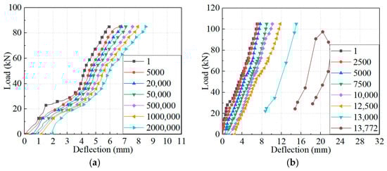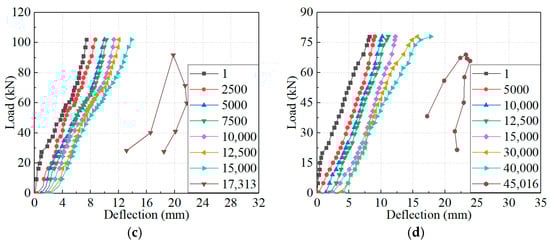The load–mid-span deflection curves under specific cycles are shown in Figure 16. In the first cycle, the load–deflection curves were approximate to double broken lines. This phenomenon was consistent with the static test. Since then, the beam specimens were cracked, and the tensile stress was mainly borne by CFRP bars. Due to the linear elastic characteristic of CFRP bars, the load–deflection curves were approximately straight. As shown in Figure 16, the initial deflection of the load–deflection curve gradually increases with cycle numbers. This was because cyclic loads caused damage to the beam specimens, which was reflected in irreversible plastic deformation, ultimately leading to the residual deflection of beam specimens. In addition, flexural stiffness gradually reduced with the increasing cycle number. This was due to the crack development caused by cyclic loads, which caused SSC in the tension zone to gradually withdraw from work. Meanwhile, the plastic development of SSC in the compression zone reduced the lever arm, which, in turn, increased the strain of CFRP bars. These reasons led to an increase in curvature and a decrease in flexural stiffness. To sum up, with the increasing cycle number, the flexural stiffness gradually decreased and residual deflection gradually increased, leading to the persistent growth in deflection at the upper loads.