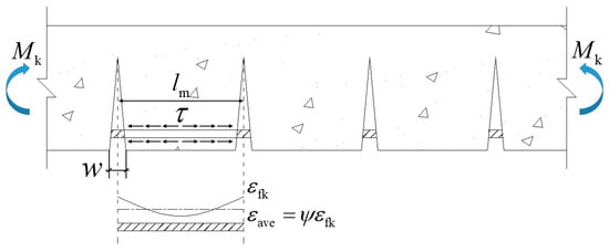 According to GB 50608-2020 [16], Figure 17 shows the calculation theory of the crack width of FRP bar-reinforced concrete beams under static loads. First, based on the elongation value of FRP bars between the average crack spacing, the average crack width was obtained by considering the reduction caused by the tensile elongation of concrete between cracks. Then, based on the average crack width obtained, the expansion coefficient considering the non-uniformity of actual crack width was introduced to calculate the short-term maximum crack width. The specific calculation equation was as follows: