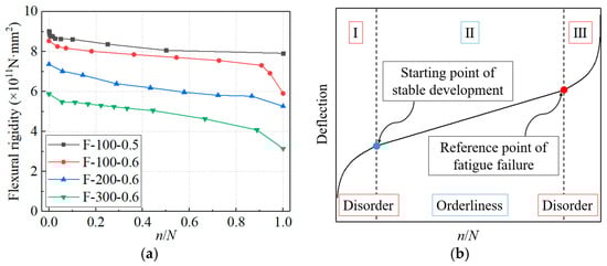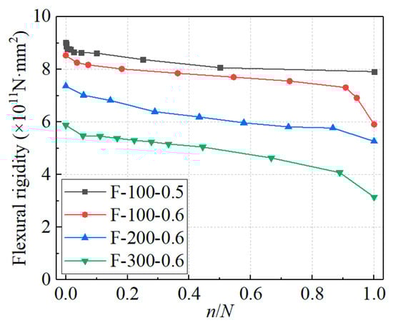 The variation in flexural stiffness with n/N is shown in Figure 18. It was well known that the flexural stiffness of the members decreased with the increase in bending moment. Therefore, the flexural stiffness of F-100-0.6 was less than that of F-100-0.5 in general. In addition, the stirrup spacing was an important factor affecting the deformation behaviour of beam specimens. Therefore, with the increasing stirrup spacing, the overall flexural stiffness of beam specimens decreased significantly, and the rate of stiffness attenuation increased. For F-100-0.5 without fatigue failure, the flexural stiffness declined rapidly in the early cycle and then declined steadily. The rapid initiation of cracks in the early cycle resulted in the rapid upward movement of the neutral axis. For the beam specimens with fatigue failure, the first two stages of flexural stiffness–n/N curves were similar to that of F-100-0.5. Subsequently, the flexural stiffness decreased significantly in the last 10% of fatigue life. This was due to the microcracks accumulated in the intermediate cycle, resulting in the unstable propagation of main cracks.