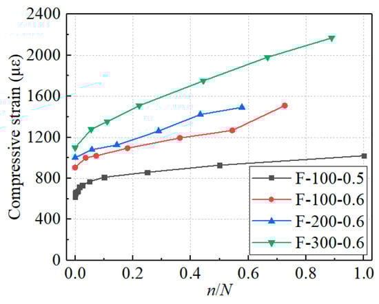 The concrete behaviour directly affected the overall behaviour of the structure. Under cyclic loads, microcracks are initiated in SSC in the compression zone, thereby leading to the residual strain, and ultimately affecting the mechanical properties of members. Figure 20 shows the variation in the compressive strain of SSC with n/N. In the early cycle, the SSC was damaged obviously due to the formation of microcracks at the aggregate–slurry interface. Therefore, the growth rate of the SSC strain was fast in this stage. In the intermediate cycle, microcracks developed regularly and the strain increased at a constant rate. In the later cycle, the strain data could not be collected due to the damage of strain gauges. Some studies found that the SSC strain increases rapidly in the later cycle and microcracks develop into macroscopic cracks [64,65]. This was one of the reasons for the rapid increase in deflection and the rapid attenuation in flexural stiffness in the later cycle.