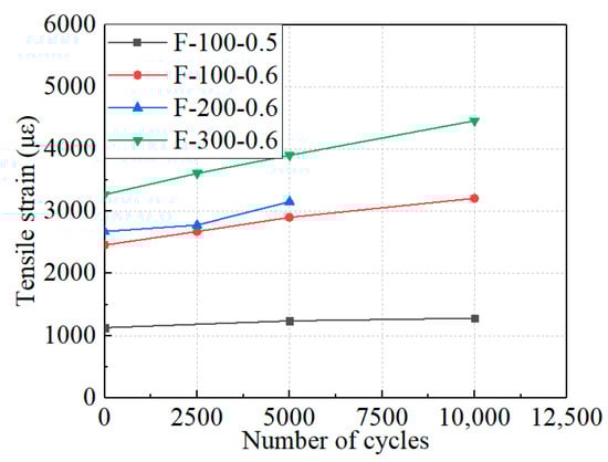 The strain gauges of CFRP bars were frequently squeezed by SSC during cyclic loading. Therefore, after a certain number of cycles, the strain gauges on the CFRP bars were damaged in succession. It can be seen from Figure 21 that with the increasing cycle number, the strain of CFRP bars at the upper loads gradually increased. This was due to a large number of microcracks in the resin matrix caused by cyclic loads, which then extended to the fibre–matrix interface, ultimately weakening the fibre–matrix interface [66].