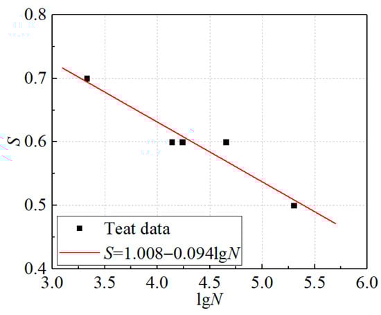 At present, the most commonly used prediction method of fatigue life in engineering is the load level–fatigue life curve (S–N curve) method. S–N curves could describe the fatigue characteristics of flexural members. Previous studies have shown that the S–N curves of concrete flexural members conform to the power function. The S–N curve of beam specimens in this paper is shown in Figure 22.