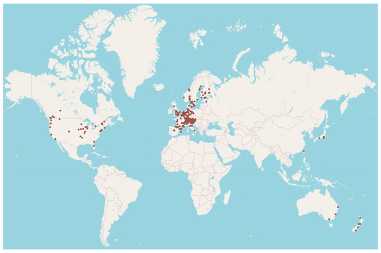 The following section explains the methods for data collection and analysis in detail. This research was conducted as a comparative global survey (Figure 1) of 646 stakeholders. These stakeholders were involved in the design and construction of the 300 built works included in the survey by Svatoš-Ražnjević et al. [26] and the related dataset [51]. This dataset was chosen because the variety of construction methods, functions, and locations of the buildings provides a wide image of the MsTB industry. The complete dataset of stakeholders is available under the following accession number: DOI: 10.18419/darus-2740 (accessed on 14 August 2023) [52]. An interactive map of both projects and stakeholders is available online at https://archstakeholders.github.io/ (accessed on 14 August 2023). The analysis is restricted to regions with available data from the preceding study: Europe, North America, Asia, and Australia and Oceania.