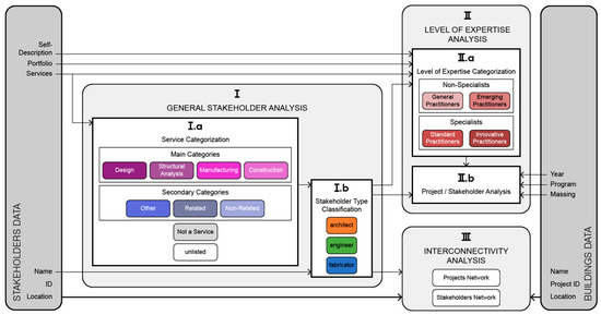Additionally, (II.b) a project/stakeholder analysis compares the results of the stakeholder analyses to a selection of data from the project database: project location, year of completion, architectural program, and massing data [51]. General stakeholder analysis results are compared to project location and year. Level of Expertise analysis results are related to year, program, and massing.