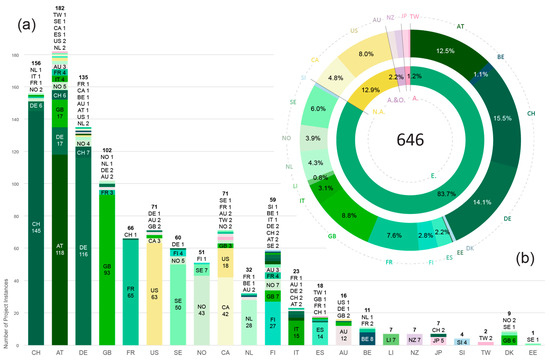 (a) Number of times stakeholders worked on a project, grouped by stakeholder location, colored by project location, sorted from highest to lowest number of matching stakeholder and project locations. (b) Ratio of stakeholders by country and continent, sorted alphabetically. Not all country percentage labels are shown.