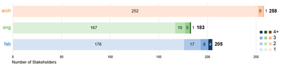 The architect type includes stakeholders involved in spatial and architectural design of buildings. The engineer type includes stakeholders offering analysis and simulation of buildings and their structures, including civil, MEP (mechanical, electrical, and plumbing), structural, and timber engineering. The fabricator type includes companies that primarily involve themselves in the physical construction of buildings, including material suppliers and timber contractors.