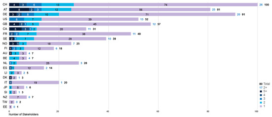 When a stakeholder was mentioned with different naming variations, the naming from their website or logotype was used. “Contact” and “impressum” pages were the source for the stakeholder’s country and city. For firms with multiple offices, the location of their corporate headquarters or main office was used. ISO 3166-1 alpha-2 country codes [53] are used throughout this study and in the stakeholders dataset.