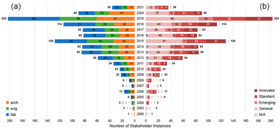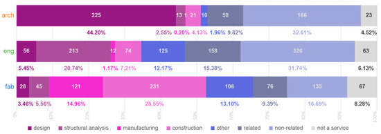 Though there are many roles in the realization of a building, including contractor or developer, stakeholders are reclassified into one of three types: architect, engineer, or fabricator. These three types were chosen to simplify further analysis. A stakeholder’s type is set based on their role, with support from their names, promotional text, or services. For example, 62% of architects have a variation of the word “architect” or its translation in their company names. Others, such as GG-loop, begin their “about” page [56] with the sentence “GG-loop is [an] architectural practice”.