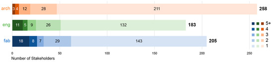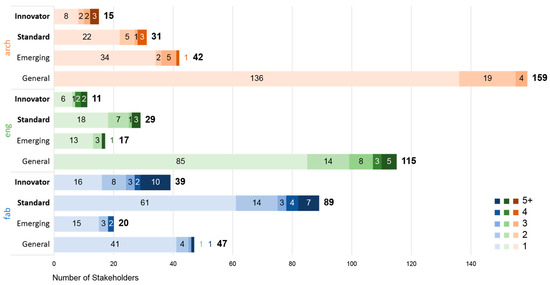In general, stakeholders did not work on multiple case study projects. Most stakeholders (75%) worked on only one project. Of the 160 stakeholders who worked on multiple projects, just over half (52%) worked on only two. The DACH region (DE—Germany, A—Austria, CH—Switzerland) has the most recurrent stakeholders, possibly due to their robust local market for timber buildings or high representation in this study. Regardless, they only account for 22%, 31%, and 26% of their totals, respectively. Figure 5 shows which countries have the most recurrent timber companies. Proportionally, Belgium, Austria, and Canada have the most recurrent stakeholders at 57%, 57%, and 35%, respectively. Austria (8 stakeholders), Canada (5), Switzerland (4), and the UK (4) have the most stakeholders who worked on five or more projects.
