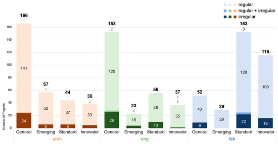 The study examines whether stakeholders’ level of expertise is correlated with their architectural output. It tracks their levels of expertise across their projects’ completion dates to identify trends. To gauge building complexity, the study uses a project’s massing and program variety from the projects database. The uses of all the projects in the buildings database are classified into one of four program groups: residential/housing, commercial, mixed-use, and public and civic. Massing is defined by analyzing the outlines of the building’s form in plan. If they are orthogonal and symmetrical, or mostly orthogonal with a small degree of non-symmetry, the building is “regular”. If the outlines are complex, non-orthogonal, or non- or semi-symmetrical, the building is “irregular”. Some buildings have both regular and irregular components and are noted as such.