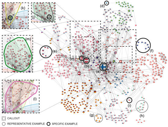 Node-link diagrams (NLs) are one of the most common network visualization techniques. In NLs, graph vertices are visually depicted as circular nodes. Graph edges are represented by straight lines connecting the nodes. The stakeholder dataset contains two entities (i.e., projects and stakeholders), leading to two NLs to visualize the relationships for each entity. The Projects NL depicts the relationships between projects, whereas the Stakeholders NL visualizes the relationships between stakeholders (see Section 3.4. Interconnectivity Results). To reduce visual clutter, a common problem in NL, d3-force algorithms [57] are used to lay out the nodes. In the case of Stakeholders NL, the network layout is further enhanced by grouping [58] the stakeholders based on the “country” attribute and, therefore, highlighting the countries with most stakeholders.