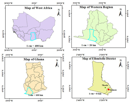 Figure 1 indicates that the Ellembelle district is situated in the Western Region of Ghana, a West African country. The location of the area of study is situated in the southern part of the region, specifically between longitudes 2°05′ W and 2°35′ W and latitudes 4°40′ N and 5°20′ N. The area under consideration is located in close proximity to the Jomoro district on its western boundary; to the north is Wassa Amenfi West, to the south is Tarkwa-Nsuaem, and to the east is Nzema East. The geographical region in question covers 1468 square kilometers, representing around 9.8% of the land in the Western Region. The population density of the area is 120 individuals per square kilometer, with a total population of 120,893 [22]. The district’s geography is primarily characterized by undulating terrain, mainly consisting of hills. The highest point in the area reaches an altitude of 450 feet above sea level [23]. The region exhibits a notable abundance of sandstone and a variety of diverse minerals, including kaolin, silica, and gold. These natural resources generate royalties and create jobs in the local community. The district exhibits the presence of rivers and streams [23]. The Ahama and Nwini Rivers are important tributaries that contribute to the flow of the Ankobra River. The northern portion of the region is drained by the Ankansa and Draw Rivers, as well as their tributaries, which also act as the boundary with Wassa Amenfi [23]. The southwestern region is home to the Amansure River, a perennial river, as well as various smaller rivers and streams. The region under consideration is situated within the humid semiarid zone of West Africa. The months of May and June exhibit the highest levels of precipitation [23]. The average amount of rainfall each year varies between 26.8 and 42.6 mm. The average temperature in the district is 29.40 °C. The district’s relative humidity varies from 27.3% to 27.9% from July to April and from 27.6% to 26.6% in May and June. The soil in the district consists mainly of ferric acrisol, which makes up approximately 98% of its composition. This soil type is suitable for cultivating a range of farming crops, such as coffee, cacao, and coconuts, as well as oil palm, plantains, and cassava [23].