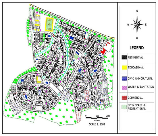 Figure 2 represents the layout of Salman resettlement village in Ellembelle, Ghana, the site for this study. A consensus was reached on the resettlement project after 24 months of talks and more than 80 meetings between affected community leaders and the mining company. This resettlement village was built in 2012. About 2200 people lived in the over 460 homes affected by the mining development. The talks led to a number of formal legal agreements that gave each property owner a choice between receiving money for their buildings and/or plants or receiving similar new homes and amenities in a new community. Importantly, unlike previous plans for moving people or groups, no terms were ever “imposed” on anyone or any group, and the resettlement plan did not lead to a war that killed civilians [24].